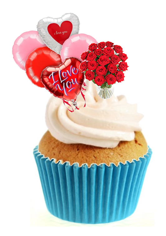 Valentines Balloons & Flowers Stand Up Cake Toppers (12 pack)